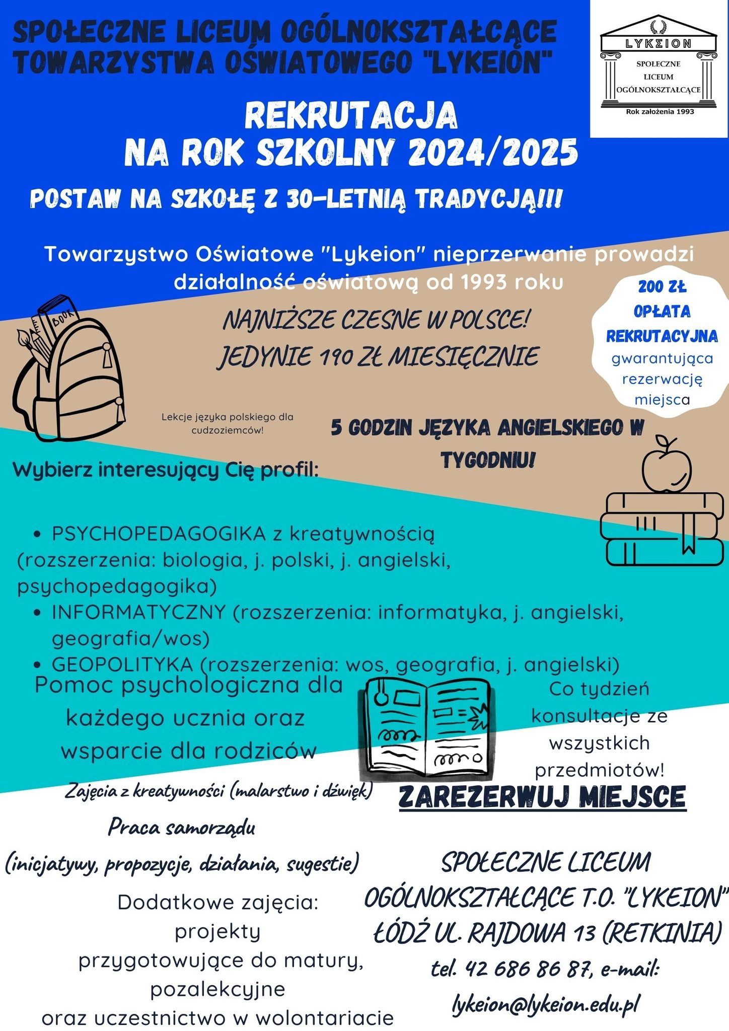 Rok założenia szkoły: ,,LYKEION'': 1993 - Najstarsze Społeczne Liceum Ogólnokształcące w Łodzi.